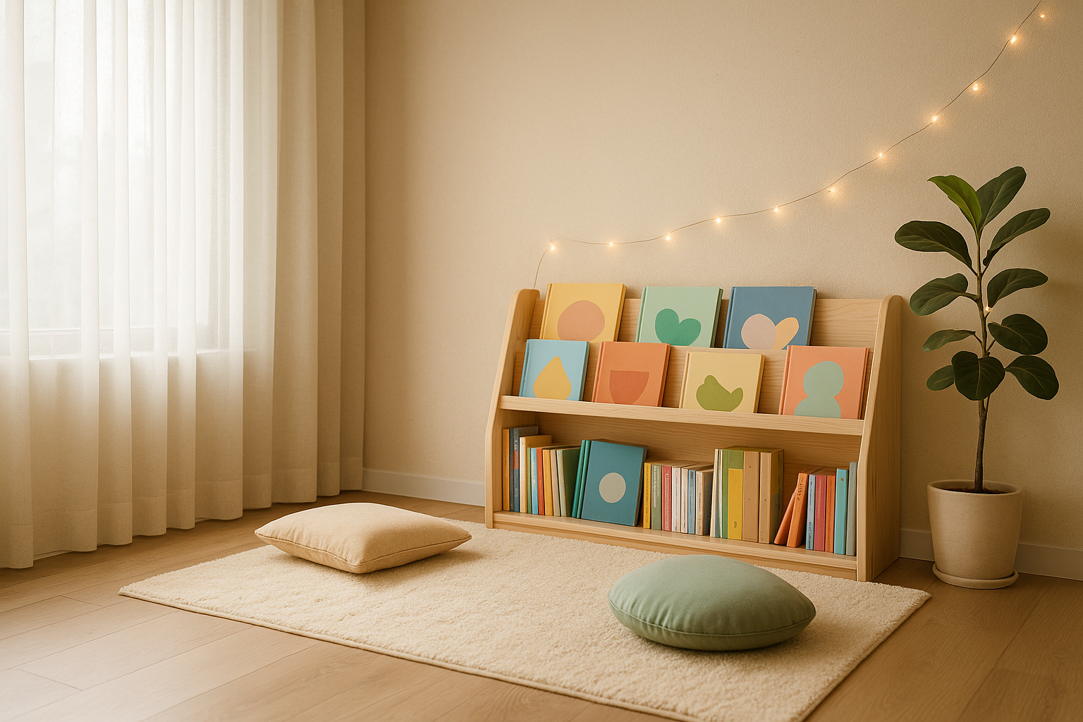 요약: 낮은 책꽂이 + 포근한 조명 + 방해 요소 최소화 = 오래 머무는 책 공간.