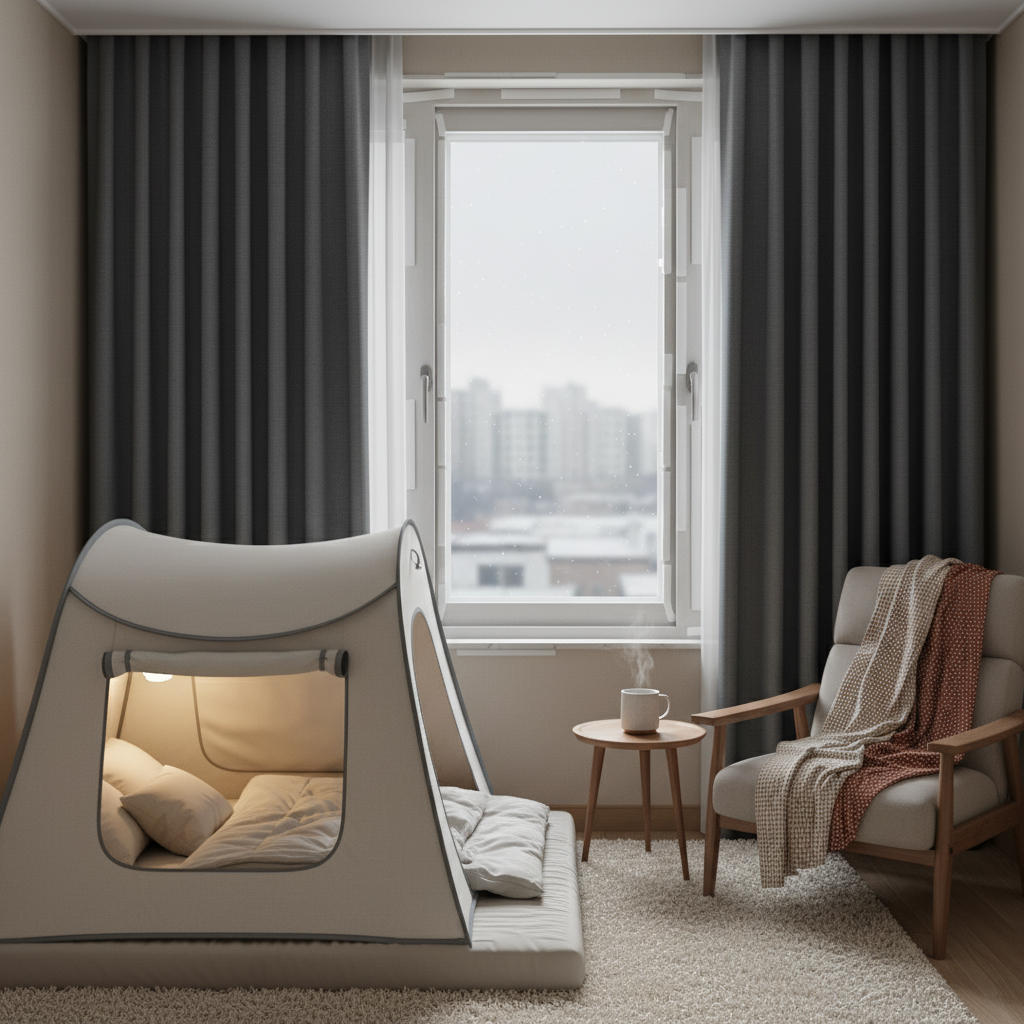 거실·침실에 난방 텐트를 설치하면 작은 공간만 집중 가열해 보일러 의존도를 크게 낮출 수 있습니다. 바닥 러그·카페트는 바닥 복사냉을 줄여 발열체가 없는 상태에서도 체감온도를 1℃ 안팎 올리는 데 도움 됩니다.